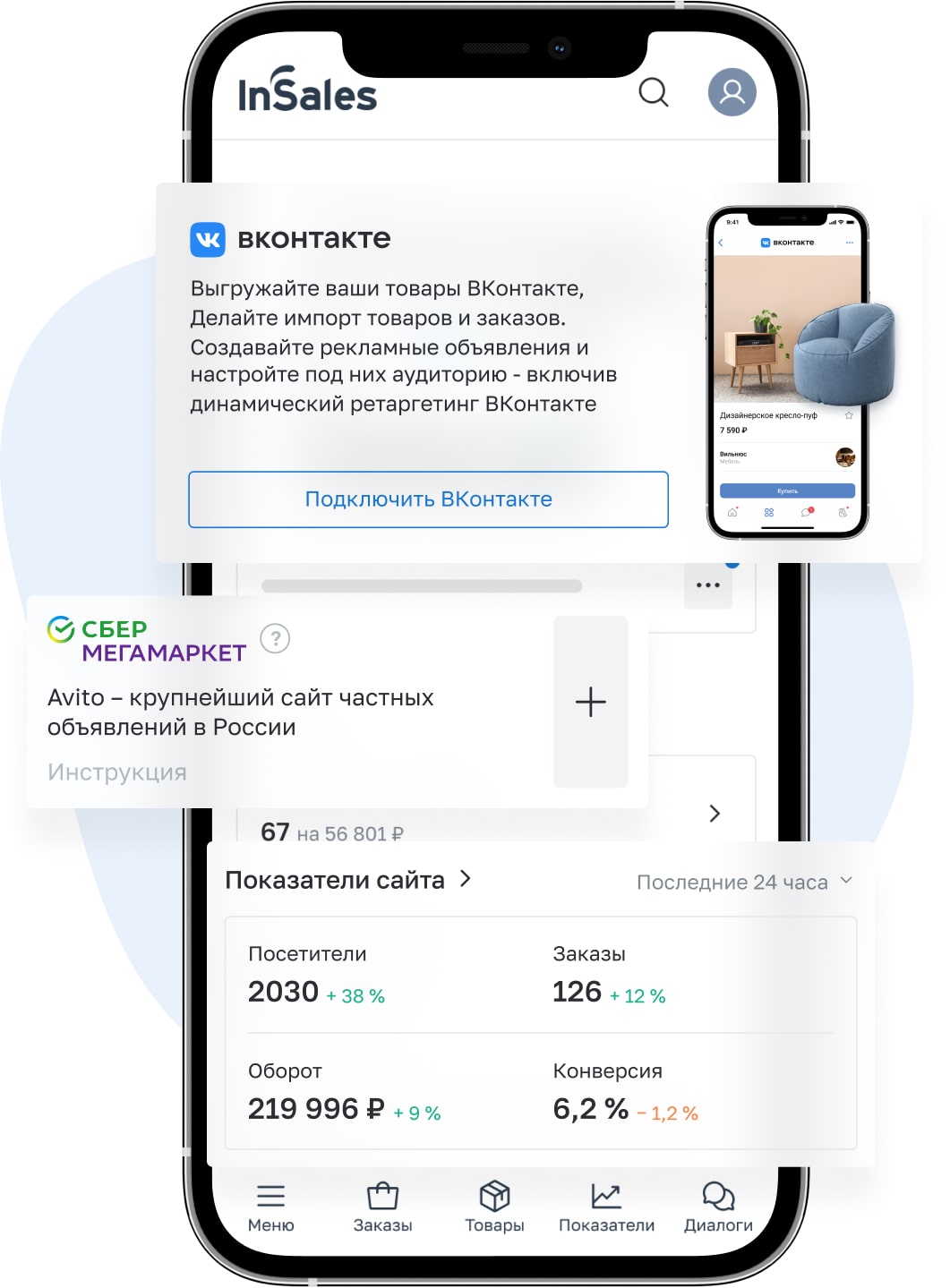 В InSales уже есть интеграции с OZON, Wildberries, AliExpress, Avito, СберМегаМаркет, Яндекс.Маркет, а также Товары ВКонтакте и Товары ОК. Всеми продажами можно управлять из одного окна, смотреть аналитику и автоматизировать работу с площадками.