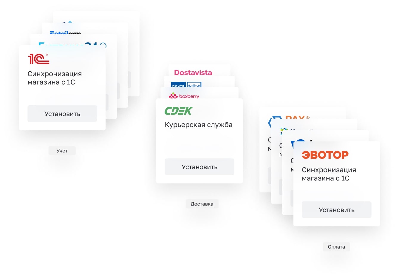 В нашей библиотеке более 300 готовых модулей и интеграций со всеми необходимыми сервисами и приложениями, начиная от доставки и оплаты, заканчивая маркетинговыми и бухгалтерскими инструментами автоматизации управления интернет-магазином.